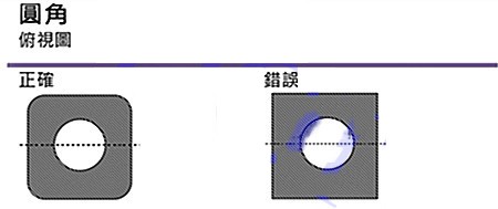 模具是由金屬製成,圓角比直角(jiǎo)容易加工。直角(jiǎo)容易加工不到(dào)位,大大增加了困難度,導致加工(gōng)週期變長(成本亦高),並很有(yǒu)可能影響產品的品質,造成(chéng)產品的缺陷(xiàn)。由上往下看時,產品應呈(chéng)圓角。