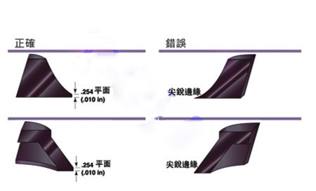 客製橡膠件有時會有尖銳邊緣的設計,但尖銳邊緣(yuán)容(róng)易在脫模時撕裂,去(qù)除毛邊時亦容易拔斷。因此,除非必要,建(jiàn)議應避免尖銳邊緣,或將尖銳邊緣做高度0.25 mm,或最少0.01 in的斷麵設(shè)計。